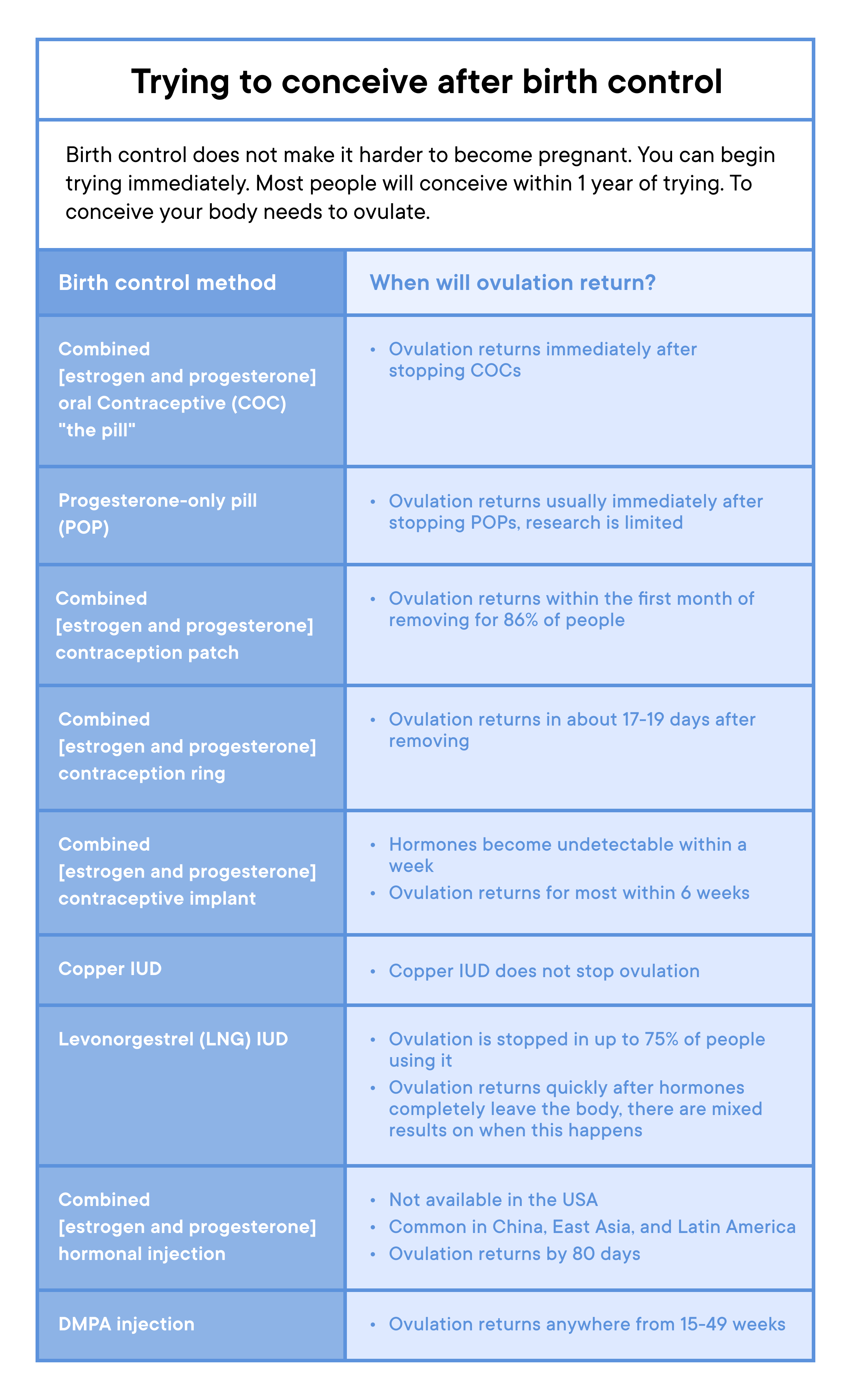 Your body needs to ovulate to become pregnant (4). Depending on the method you are ending, the time it takes to start ovulating may differ (4).